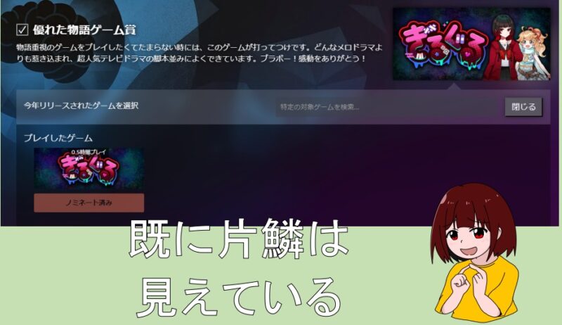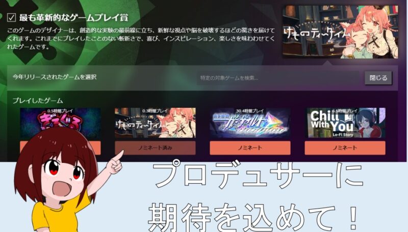 各部門のテーマに沿った作品をプレイしていれば勝手に候補に選ばれてきますし、該当作品プレイしてなくても運営側で候補を紹介してくれます。