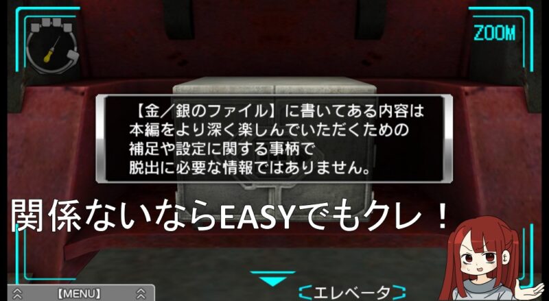 謎解きに詰まったらステージ毎でEASYに切り替え可能なのですが、その代わり今作のシークレット(ゲーム世界の豆知識や裏設定等)が入ったファイルが金→銀に格落ちします。(回収シークレット減)